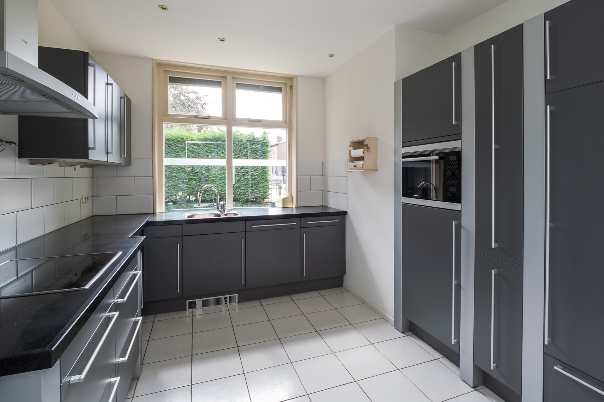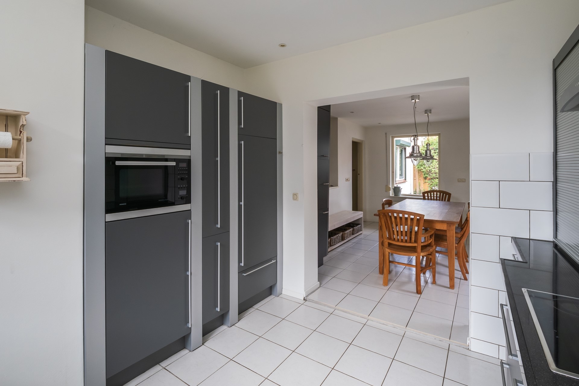 De woonkeuken is een plek waar koken en samenzijn moeiteloos in elkaar overgaan. Dankzij de vloerverwarming en de plavuizenvloer voelt de ruimte comfortabel aan, terwijl de strakke afwerking van wanden en plafond zorgt voor een frisse uitstraling. Er is ruimte voor een royale eethoek, waar je gezellig een kop koffie kunt drinken of uitgebreid kunt tafelen met familie of vrienden. De keukenopstelling in antracietkleur is van alle gemakken voorzien. Je beschikt over een 1,5 spoelbak, keramische kookplaat, afzuigschouw, combimagnetron, koelkast, vaatwasser en volop bergruimte in de apothekerskast, laden en overige kastruimten.