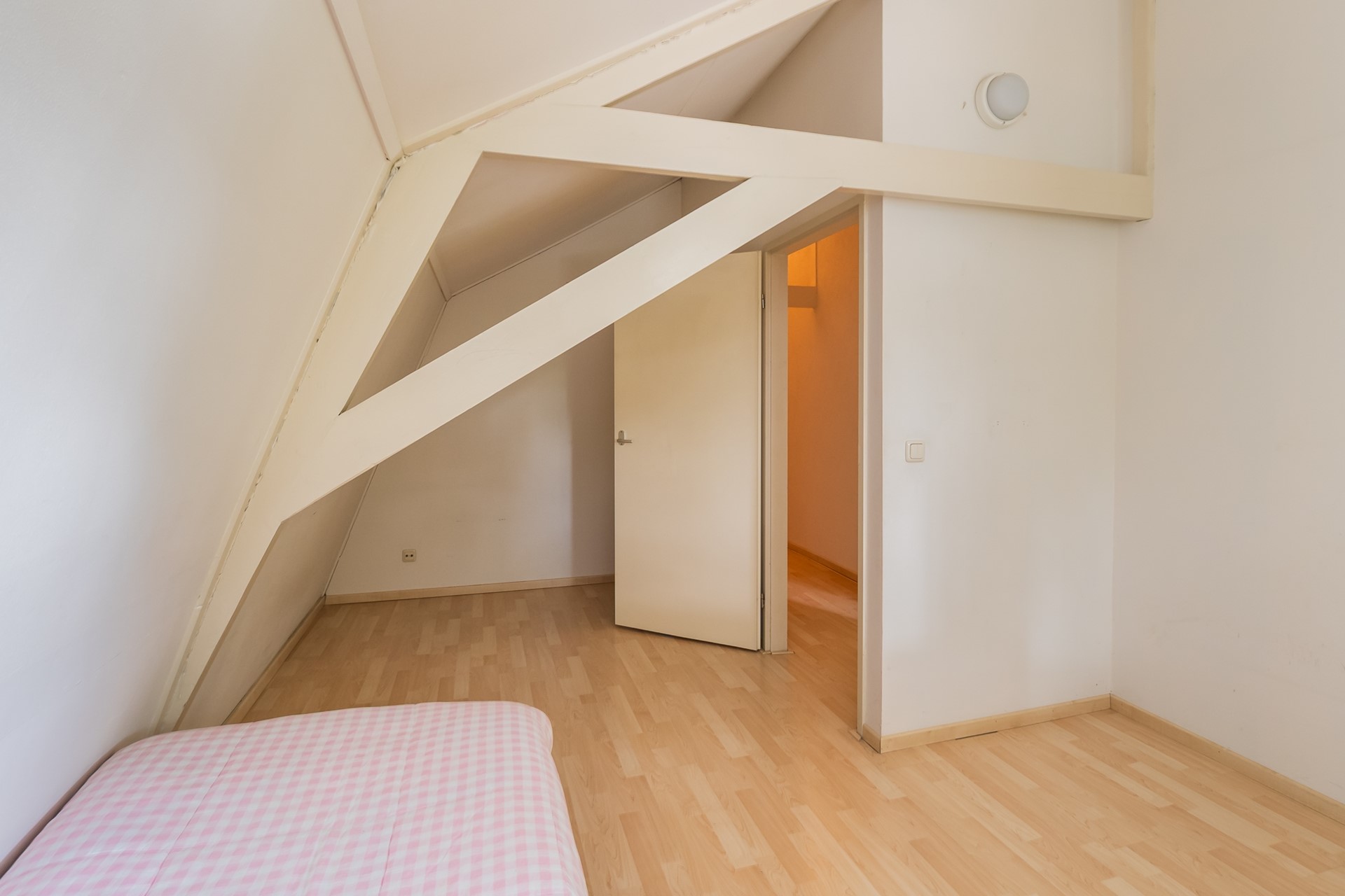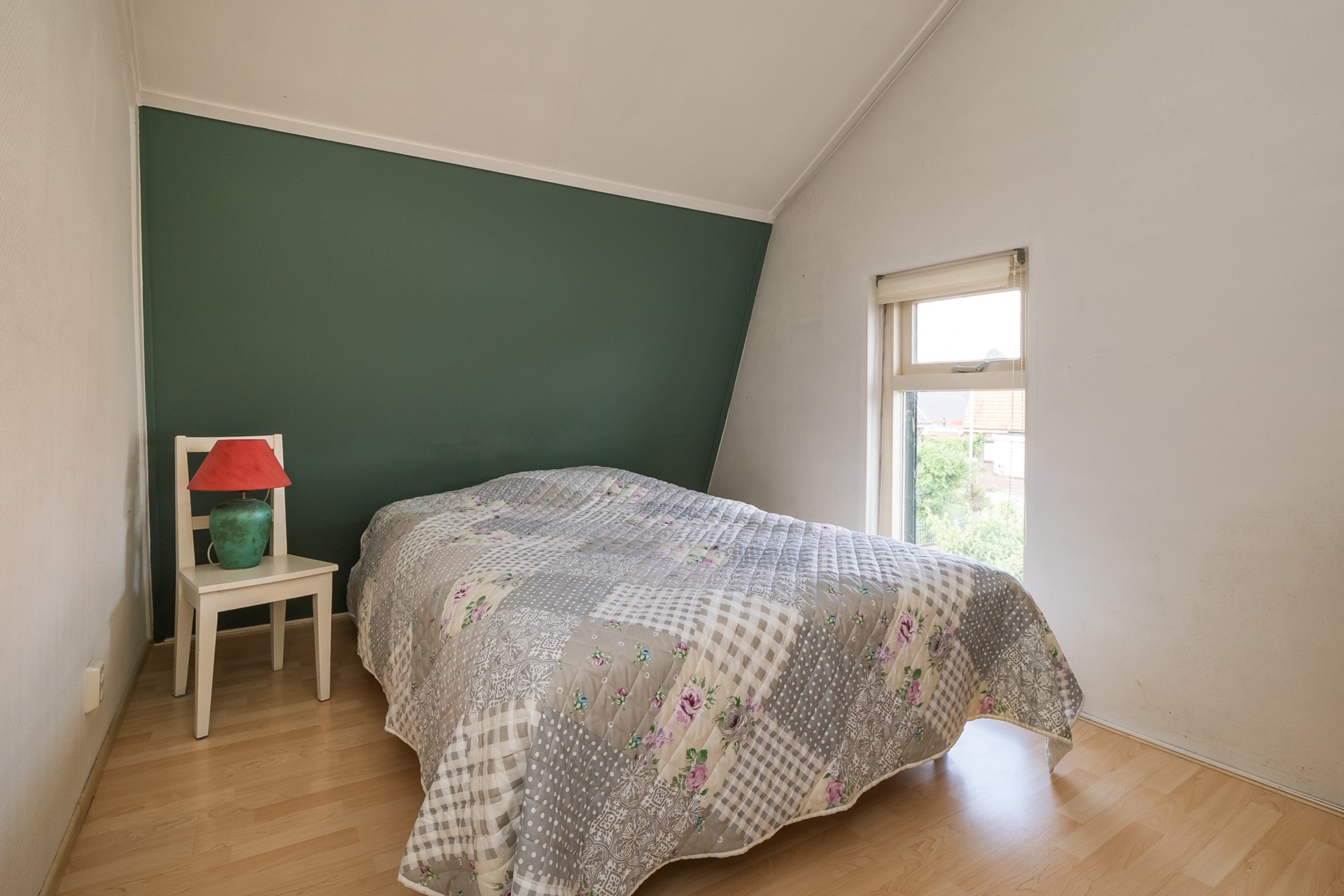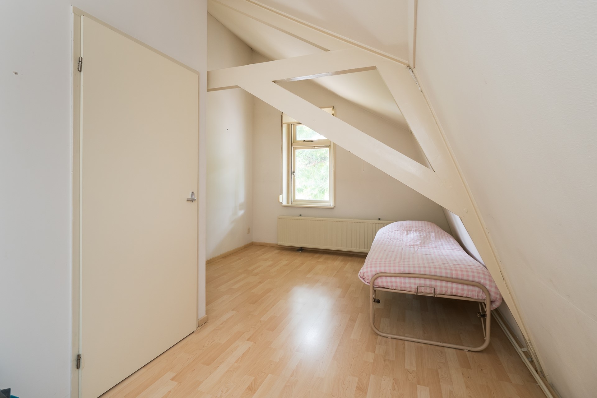 De eveneens ruime tweede en derde slaapkamer liggen aan de voorzijde van het huis en bieden een mooi uitzicht over de voortuin richting de Achterweg. De karakteristieke balken van de dakconstructie zijn in het zicht gehouden en zorgen voor een charmante uitstraling.