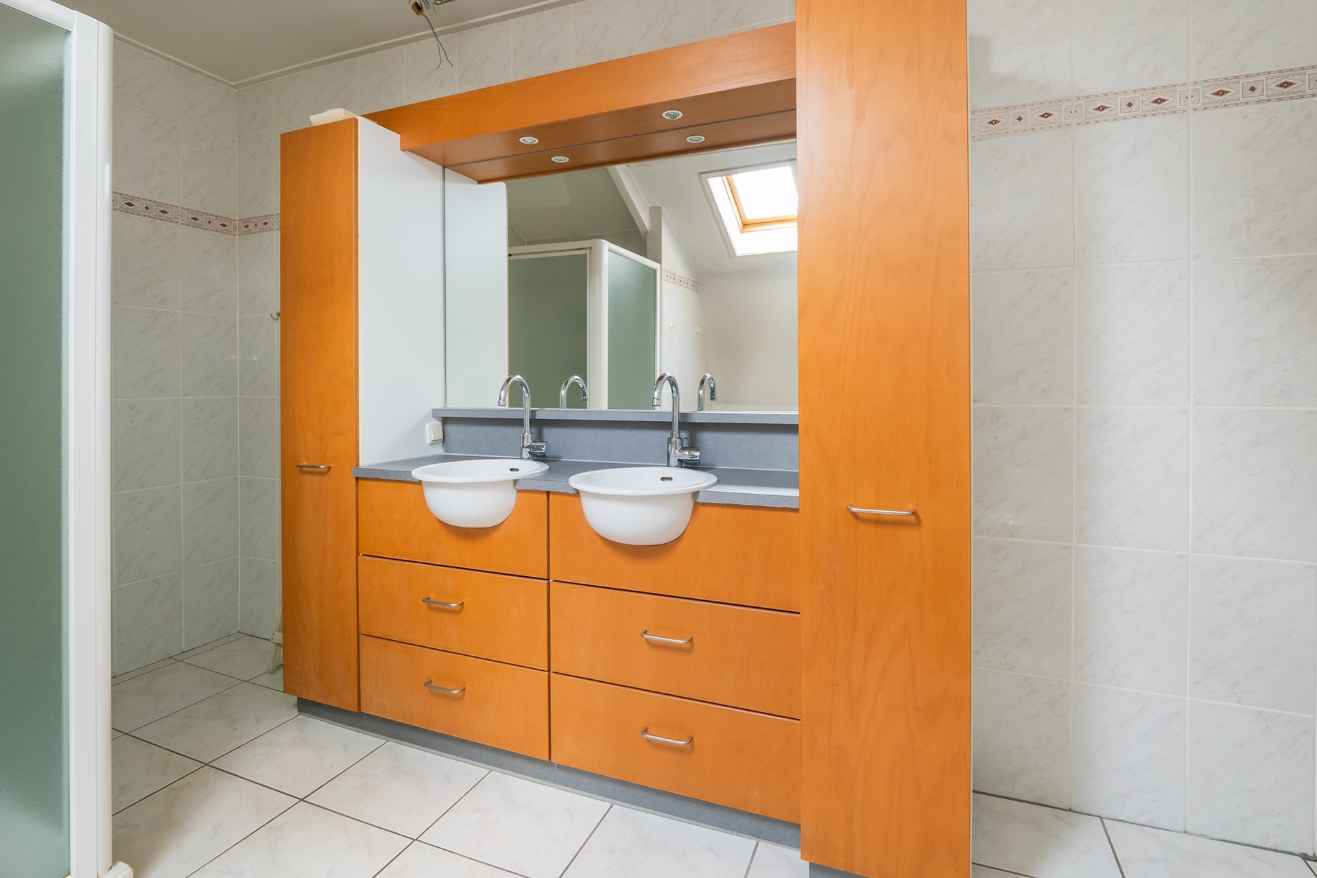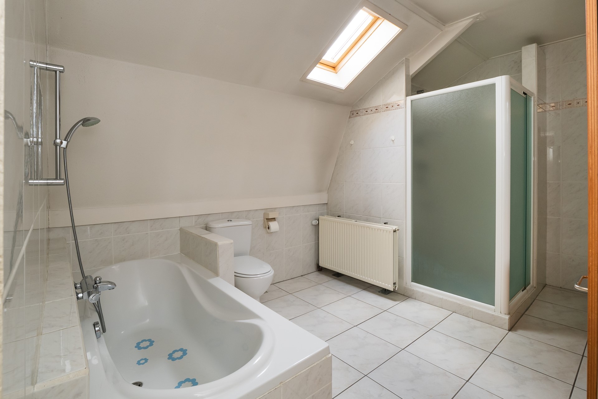 De royale badkamer is zeer compleet ingericht met een ligbad, douchecabine, toilet en een duo-wastafelmeubel met spiegel en verlichting. Het Velux-dakvenster zorgt voor daglicht en ventilatie. Gezien de royale opzet biedt deze badkamer ook alle ruimte om naar eigen smaak te moderniseren.