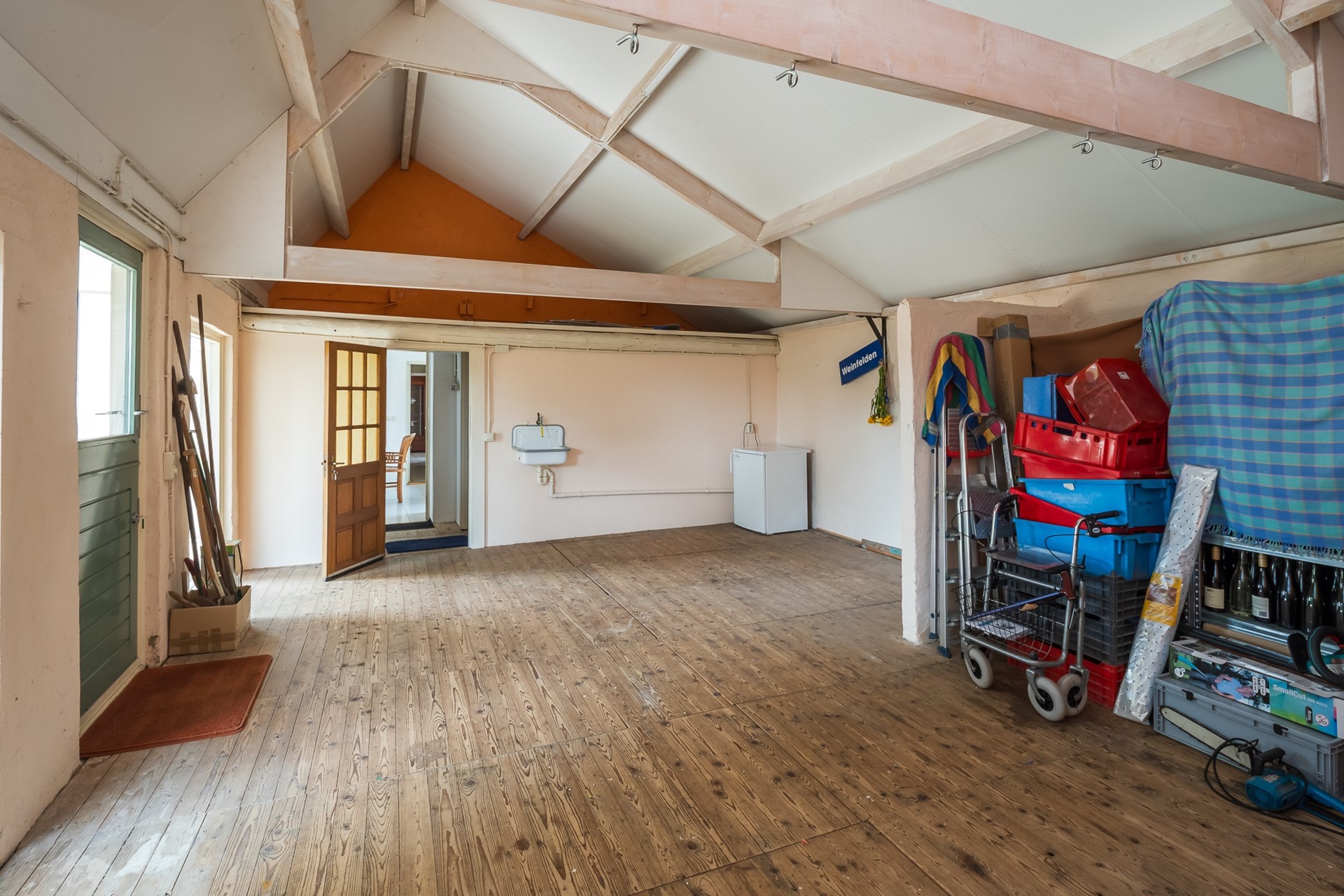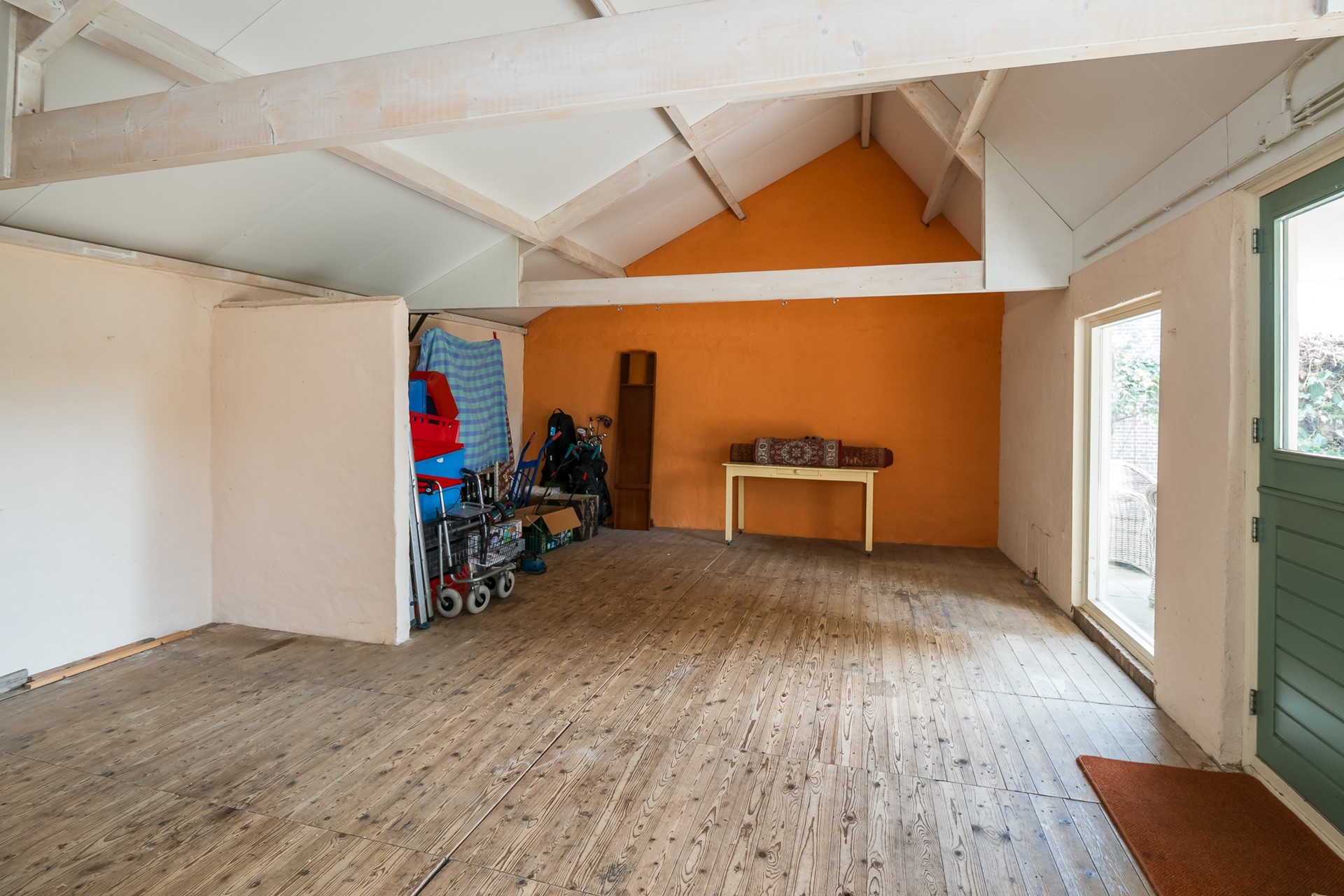 De multifunctionele atelierruimte voelt als een dynamisch verlengstuk van je woonruimte. Het vertrek is royaal opgezet en open tot in de daknok, wat het gevoel van ruimte nogmaals versterkt. Dankzij de manshoge ramen en openslaande deur is er een sterke verbinding met de veranda en de tuin. Dit maakt het niet alleen een inspirerende plek om te werken of een hobby uit te oefenen, maar ook uitermate geschikt om kinderen te laten spelen, een praktijk aan huis te voeren of om sfeervolle bijeenkomsten en feestjes te organiseren. Praktisch zijn de aanwezigheid van een uitstortgootsteen en een kleine bergzolder.